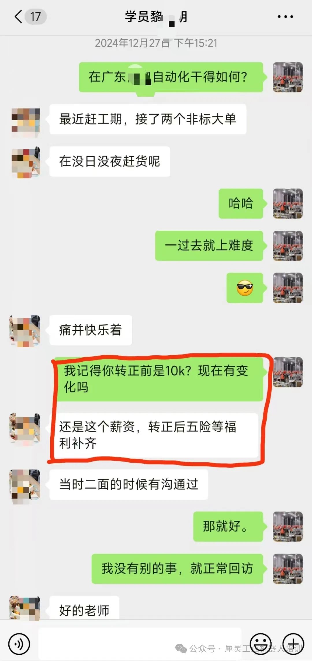 最近,犀靈機(jī)器人培訓(xùn)中心的老師對(duì)黎同學(xué)進(jìn)行了就業(yè)回訪。在回訪中,黎同學(xué)表示,雖然目前工作忙碌,但他對(duì)自己的職業(yè)發(fā)展充滿信心。他還記得轉(zhuǎn)正前的薪資是10k,轉(zhuǎn)正后五險(xiǎn)等福利也會(huì)補(bǔ)齊,這讓他感受到了公司對(duì)員工的重視。