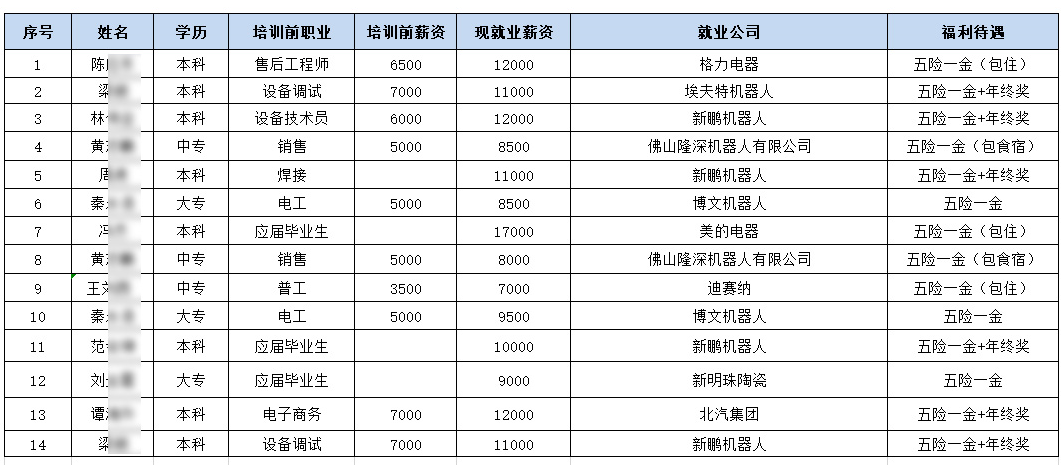 第一期學(xué)員2017年4.10號畢業(yè),共14位學(xué)員,截止2019年2.23日,平均薪金為10464元,最讓人振奮的是他們居然100%還在從事著與工業(yè)機(jī)器人相關(guān)的工作。
