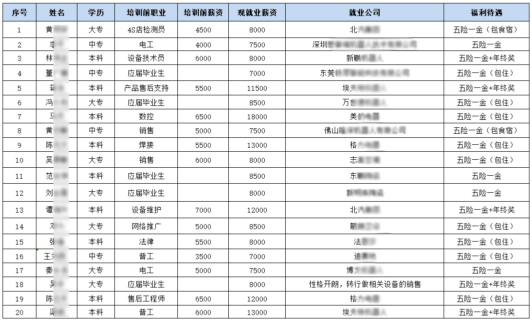 第四期學員2017年7.10號畢業(yè),共20位學員,截止2019年2.23日,平均薪金為9475元,目前95%的學員還在從事著與工業(yè)機器人相關(guān)的工作。