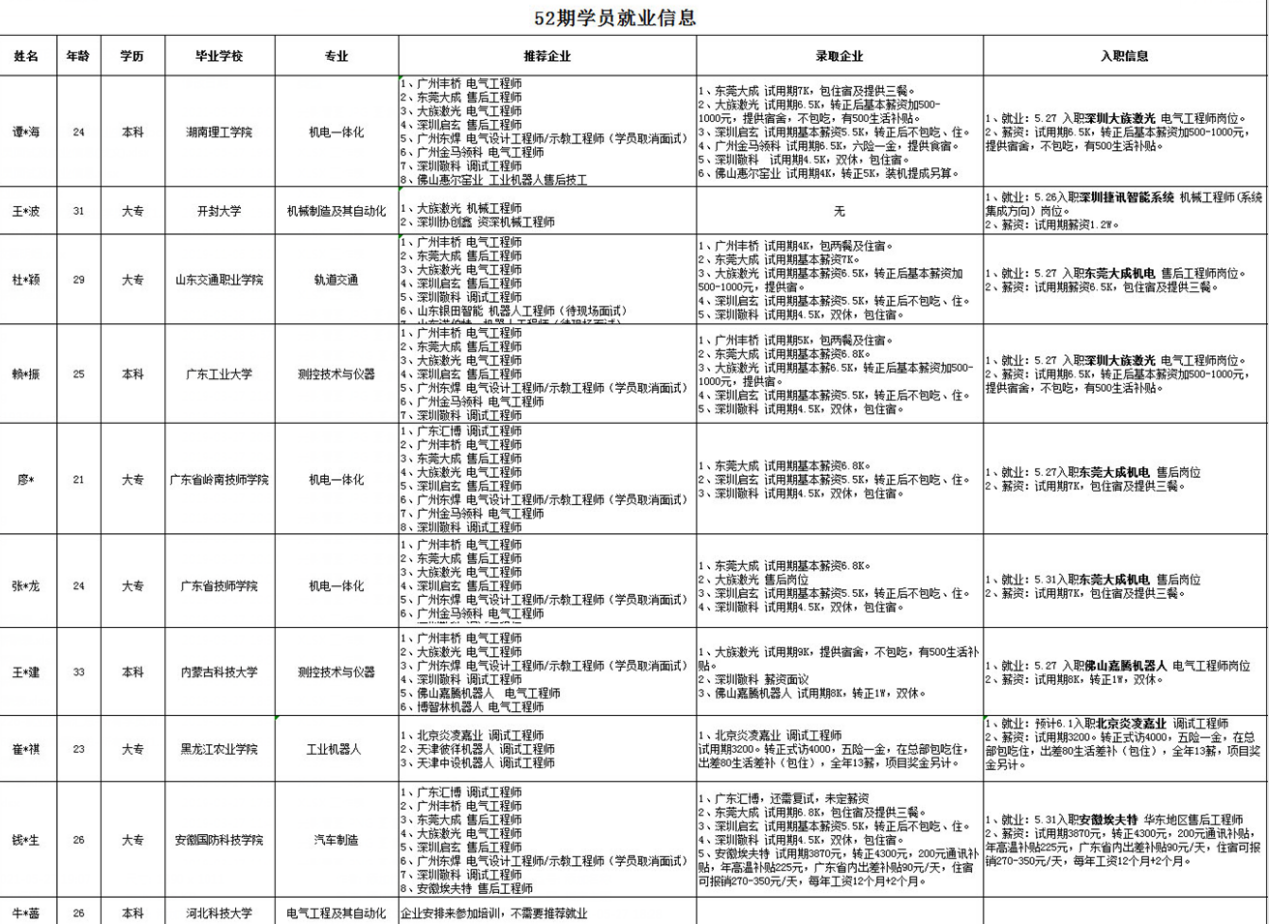 52期共10位學(xué)員,其中牛*薔同學(xué)由于是企業(yè)安排來參加培訓(xùn),不需要推薦就業(yè)。其他學(xué)員在經(jīng)過努力后,都已實(shí)現(xiàn)就業(yè),試用期平均薪金為7015元,預(yù)計轉(zhuǎn)正后平均薪資8000元左右,剛就業(yè)時就能達(dá)到這個工資水平,小犀真心的為他們高興。