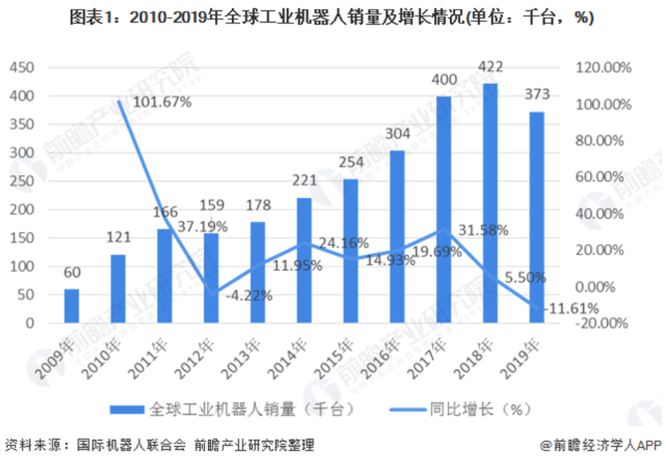 2009-2018年,工業(yè)機(jī)器人全球銷量波動上升,并在2018年達(dá)到了42.2萬臺。2019年,全球工業(yè)機(jī)器人銷量為37.3萬臺左..