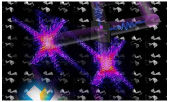 該圖片顯示了實(shí)驗(yàn)的基本要素。通過X射線激光脈沖從兩個(gè)方向照射物體(在圖像中心切出十字)。在下一步驟中,將星形衍射圖像重建為3-D對(duì)..
