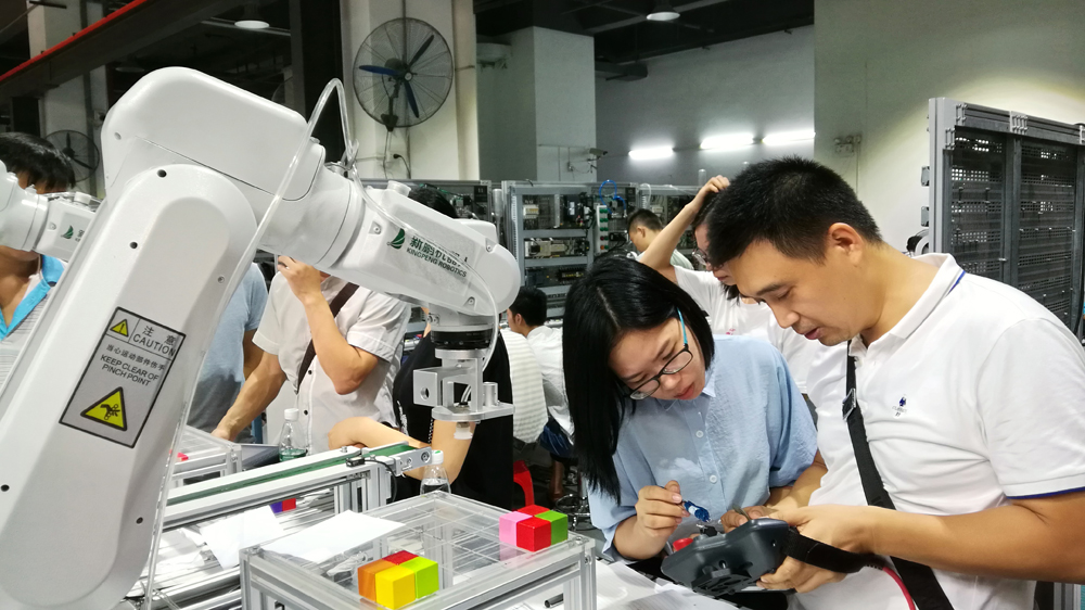 在隨后的幾天,骨干教師們就進入到機器人的實踐學習中。40多位老師分成多組,在犀靈機器人培訓中心將進行相關的工業(yè)機器人集成項目設計。課程由犀靈的陳老師以理論與實踐相結合的方式進行講授,教師們認為課程系統(tǒng)且有深度,能夠從中學到較多實用的東西。