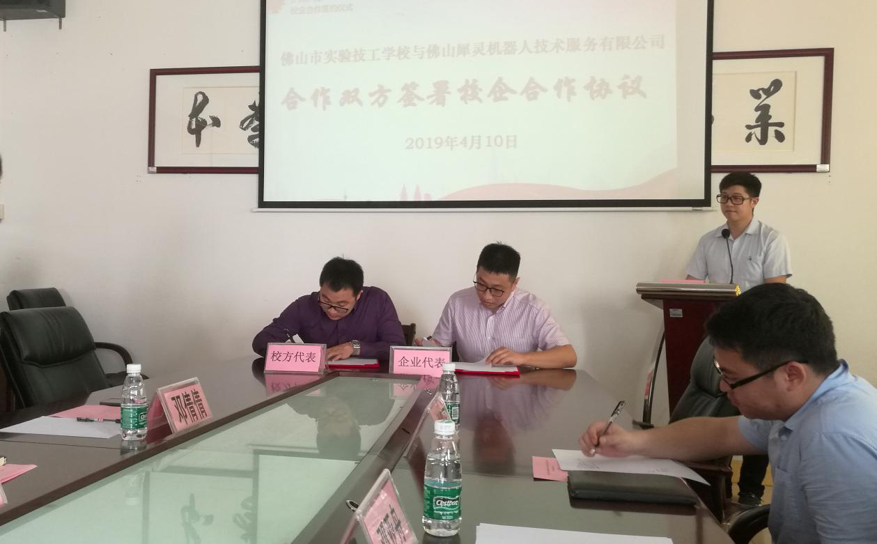 2019年4月10日上午,在佛山市實驗技工學(xué)校會議室舉行佛山犀靈機(jī)器人技術(shù)服務(wù)有限公司與佛山市實驗技工學(xué)校校企合作簽約儀式。