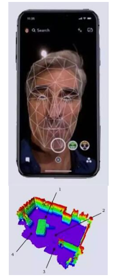 ? 圖4:人臉識(shí)別(上圖)和視覺同步定位和映射(下圖)是3D圖像傳感所實(shí)現(xiàn)的眾多功能中的兩個(gè)。