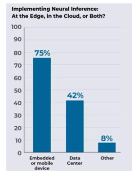 EVA最新的開發(fā)者調(diào)查結(jié)果不出所料地顯示,大多數(shù)受訪者至少在邊緣設(shè)備上做了一些神經(jīng)網(wǎng)絡(luò)推理(見圖9,由于調(diào)查對(duì)象要求標(biāo)記所有他們的項(xiàng)目使用的處理器,所以總數(shù)超過100%)。然而,近一半的受訪者也在云中進(jìn)行部分或全部推理。