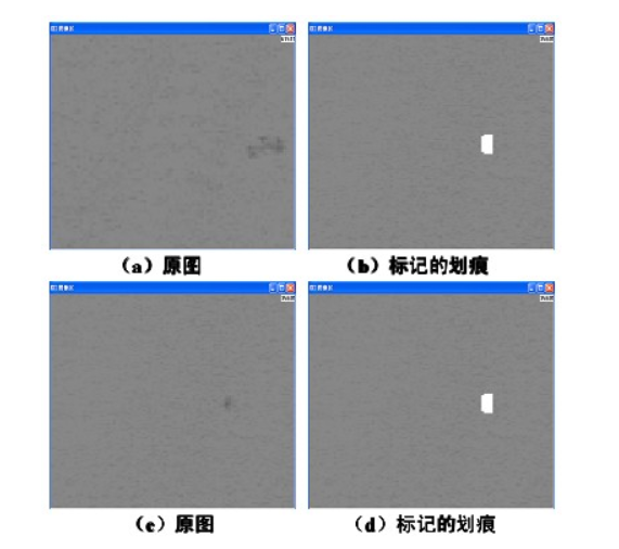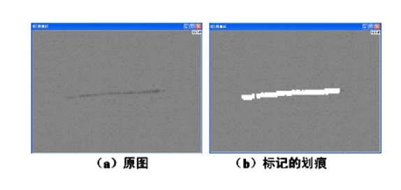 第二類劃痕,部分灰度值變化并不明顯,整幅圖像灰度比較平均,劃痕面積也比較小,只有幾個像素點,灰度也只比周圍圖像稍低,很難分辨。可以對原圖像進行均值濾波,得到較平滑的圖像,并與原圖像相減,當其差的絕對值大于閾值時就將其置為目標,并對所有的目標進行標記,計算其面積,將面積過小的目標去掉,剩下的就標記為劃痕。
