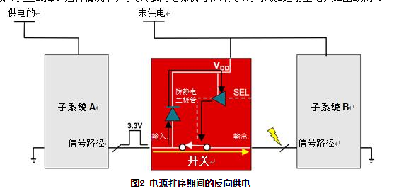 與圖1對(duì)比,來(lái)自子系統(tǒng)A的3.3V信號(hào)為內(nèi)部靜電放電二極管反向供電,從而接通開(kāi)關(guān)。這將關(guān)閉通往子系統(tǒng)B的信號(hào)路徑,使信號(hào)從開(kāi)關(guān)中(黃色箭頭)漏出,從而出現(xiàn)錯(cuò)誤的邏輯狀態(tài),這可能會(huì)損壞子系統(tǒng)B并中斷系統(tǒng)啟動(dòng)。