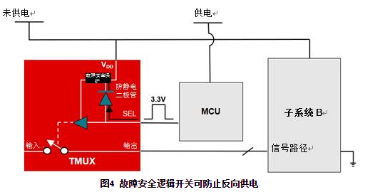 如果沒(méi)有故障保護(hù)邏輯,則SEL或EN管腳中的邏輯信號(hào)會(huì)向VDD反向供電,從而損壞子系統(tǒng)B和開(kāi)關(guān)本身。該開(kāi)關(guān)類(lèi)似于斷電保護(hù),可在SEL邏輯管腳上保持高阻抗?fàn)顟B(tài),從而防止電源在電源排序期間流經(jīng)VDD。