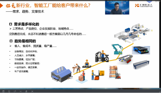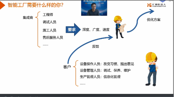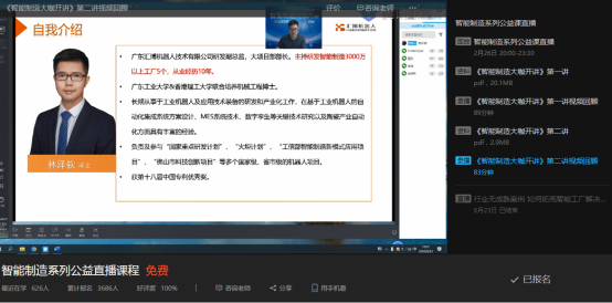 此前,由匯博機器人秦磊博士帶來的《智能制造大咖開講》第一講,反響非常熱烈并得到大家的肯定。但顯然一場線上講座是遠不能夠整體呈現智能工廠的全部精華,為此我們特地邀請到匯博林澤欽博士為大家?guī)淼诙v,針對走進新行業(yè),且沒有成熟案例如何才能拓荒新行業(yè)智能工廠建設的課題,為大家?guī)砭实闹v解。本次講座共有一千多人參加了當天的直播,很多學員由于各種原因未能參加直播,但這絲毫不影響他們的學習熱情,學員紛紛在學習群里找管理員索取錄播網址進行學習,可見大家對匯博機器人實力及其課程的期待與支持! 本次培訓,由匯博機器人工業(yè)領域廣東匯博機器人研發(fā)副總監(jiān)、大項目部部長,曾主持研發(fā)智能制造3000萬以上工廠5個,從業(yè)經歷10年的林澤欽博士主講。在智能制造領域,能主持研發(fā)智能制造3000萬以上項目5個,并且擁有10年從業(yè)經歷,即便在高手云集,大咖層出的智造圈里,就這一點而言也足以稱得上優(yōu)秀。林博士為學員們帶來了精彩講座,切實幫助大家提高了實戰(zhàn)技能。為時一個半小時的公益直播課內容豐富,互動充分,既有前沿的技術,又有實用的項目講解。 課程內容充實,干貨滿滿! 晚上20:00,林博士正式帥氣登場,準時開講。幽默風趣的開場白和自我介紹、儒雅的學者風范馬上收獲了大家的好感,圈粉無數。