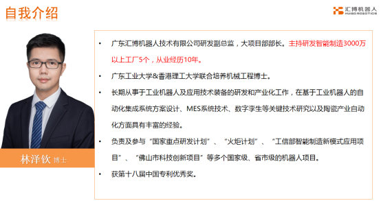 作為廣東匯博機器人技術有限公司研發(fā)部副總監(jiān),大項目部部長。廣東工業(yè)大學&香港理工大學聯合培養(yǎng)機械工程博士。林博士主持研發(fā)智能制造3000萬以上項目工廠超過5個,從業(yè)經歷10年。獲第十八屆中國專利優(yōu)秀獎。長期從事工業(yè)機器人及應用技術裝備的研發(fā)和產業(yè)化工作,在基于工業(yè)機器人的自動化集成系統方案設計、MES系統、數字孿生等關鍵技術研究以及陶瓷產業(yè)自動化方面具有豐富的經驗。負責及參與“國家重點研發(fā)計劃”、“火炬計劃”、“工信部智能制造新模式應用項目”、“佛山市科技創(chuàng)新項目”等多個國家級、省市級的機器人項目。年輕有為獲得業(yè)內極大認可。
