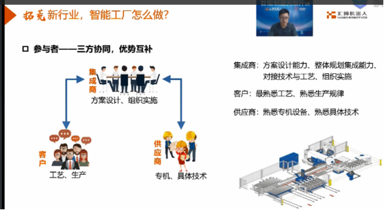 智能工廠由三方協同落地,集成商充分發(fā)揮方案設計能力、整體規(guī)劃能力方面的優(yōu)勢;客戶最熟悉工藝及生產規(guī)律,但客戶并不擅長工業(yè)機器人系統的理解并不深入;供應商熟悉專機設計和具體技術,但供應商會更傾向做標準化產品。如何協調這三方更好的合作實施,智能到底該怎么做?林博士做出了精辟的講解,詳情觀看精彩講座回放。