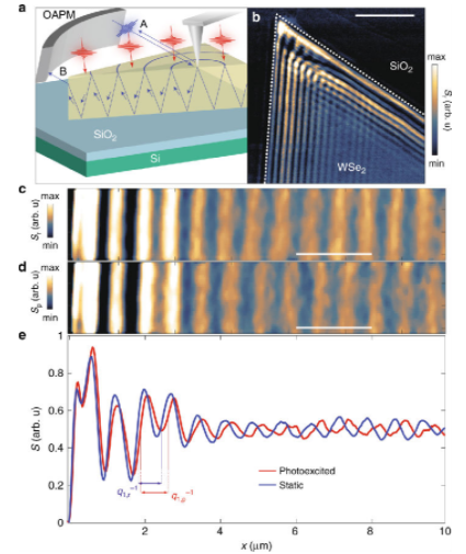 a:實(shí)驗(yàn)示意圖(藍(lán)色為Probe光,紅色為Pump光);b:近場(chǎng)納米光學(xué)成像 c: 在穩(wěn)態(tài)下,WSe2邊緣的近場(chǎng)光學(xué)振幅圖像;d: 光激發(fā)態(tài)下,延遲時(shí)間 Δt=1ps的WSe2邊緣的近場(chǎng)光學(xué)振幅圖像;e: 分別對(duì)c、d進(jìn)行截面分析,獲取定量數(shù)據(jù)。Probe探測(cè)能量,E=1.45 eV