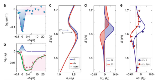 為了弄清各種瞬態(tài)機(jī)制,微分色散關(guān)系被研究者引入。首先,研究者定義了微分關(guān)系:δqj=qj,p – qj,r,(j=1,2 分別代表波矢的實(shí)部和虛部,p, pump激發(fā)態(tài),r 穩(wěn)態(tài))。研究者的理論及實(shí)驗(yàn)微分色散關(guān)系結(jié)果(圖3 d、e)成功顯示了光誘導(dǎo)轉(zhuǎn)變中A-exciton的動(dòng)力學(xué)行為。結(jié)果表明:A-exciton附近微分色散的特征是由兩個(gè)伴隨效應(yīng)引起的:(i)僅在Δt=0時(shí)觀察到的A-exciton的7 meV藍(lán)移;(ii)A-exciton的漂白(定義為光譜頻譜展寬和/或振蕩強(qiáng)度降低(見(jiàn)圖3d)。趨勢(shì)(i)在1 ps內(nèi)恢復(fù),與抑制耗散的動(dòng)力學(xué)一致(圖3a)。因此,研究者得出結(jié)論,A-exciton共振的瞬態(tài)藍(lán)移是由于相干的光誘導(dǎo)過(guò)程所引起。趨勢(shì)(ii)持續(xù)時(shí)間更長(zhǎng),因此歸因于非相干激子動(dòng)力學(xué)。