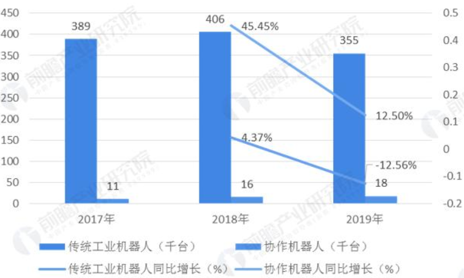 工業(yè)機(jī)器人又分為傳統(tǒng)工業(yè)機(jī)器人(非人機(jī)協(xié)作)以及協(xié)作機(jī)器人,其中全球傳統(tǒng)工業(yè)機(jī)器人在2019年出貨量達(dá)到35.5萬臺,同比下降12.56%;全球協(xié)作機(jī)器人出貨量1.8萬臺,在低基數(shù)之下同比上升12.50%。