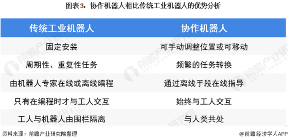 傳統(tǒng)工業(yè)機(jī)器人主要針對高端制造行業(yè)應(yīng)用,往往體型巨大、安裝編程周期長且部署成本高,單獨(dú)的機(jī)器人無法直接用于工廠的生產(chǎn)線上,還需要很多外圍設(shè)備的支持。傳統(tǒng)工業(yè)機(jī)器人在導(dǎo)入電子等生產(chǎn)周期短、產(chǎn)品更新?lián)Q代快的領(lǐng)域時(shí),受準(zhǔn)備啟動(dòng)時(shí)間和性價(jià)比等因素影響,應(yīng)用往往不太順利。而協(xié)作機(jī)器人重量輕、適應(yīng)性強(qiáng),一般制造業(yè)及中小型公司非常需要這樣的機(jī)器人。并且協(xié)作機(jī)器人是以保護(hù)人類安全、實(shí)現(xiàn)人機(jī)共事為設(shè)計(jì)初衷設(shè)計(jì)的,是一種可以在一定區(qū)域內(nèi)安全的與人類進(jìn)行直接交互的機(jī)器人,其擁有兩個(gè)特點(diǎn):一是機(jī)器與人的互動(dòng),互相合作;一是機(jī)器的編程和維護(hù)非常方便。