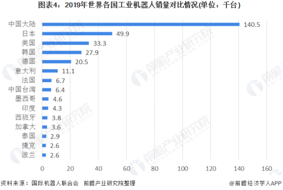 2019年, 中國大陸工業(yè)機(jī)器人銷量達(dá)到了14.05萬臺,其占全球銷量的37.67%,成為全球工業(yè)機(jī)器人供應(yīng)的第一大國。日本、美國、韓國和德國工業(yè)機(jī)器人銷量分別為4.99萬臺、3.33萬臺、2.79萬臺和2.05萬臺,分別占全球銷量的13.38%、8.93%、7.48%和5.50%。