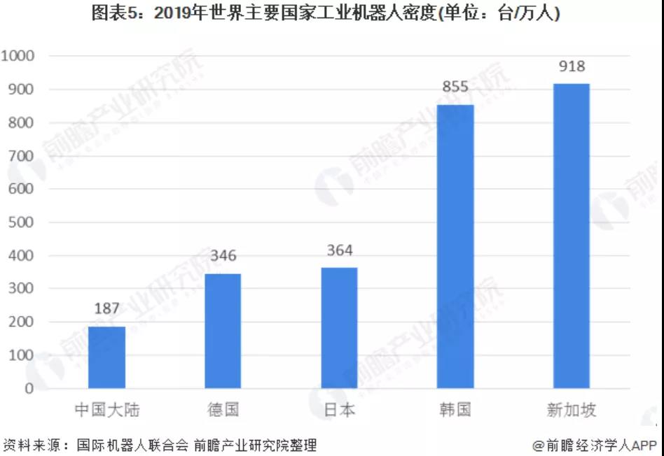 近年來,世界主要國家工業(yè)機(jī)器人密度均有所提升。2019年,中國大陸的工業(yè)機(jī)器人密度(工業(yè)機(jī)器人保有量/IFR統(tǒng)計(jì)的制造業(yè)就業(yè)人數(shù))達(dá)到了187臺/萬人,相較2018年的140臺/萬人有了明顯提升。我國工業(yè)機(jī)器人密度提升主要是由工業(yè)機(jī)器人保有量的提升與制造業(yè)從業(yè)人員數(shù)量的下降兩項(xiàng)因素疊加共同帶動(dòng)的。但是我國工業(yè)機(jī)器人密度與傳統(tǒng)工業(yè)強(qiáng)國德國、日本、韓國、新加坡等仍有較大差距,僅相當(dāng)于日本的二分之一左右,相當(dāng)于新加坡的五分之一左右。