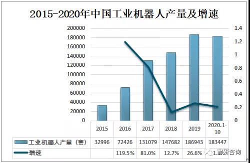 近幾年,中國工業(yè)機器人產(chǎn)業(yè)發(fā)展速度較快,產(chǎn)量逐年增加,2019年中國工業(yè)機器人產(chǎn)量為186943套,較2018年的147682套同比增長26.6%;2020年1-10月中國工業(yè)機器人產(chǎn)量為183447套,較2019年同期增長21.4%。
