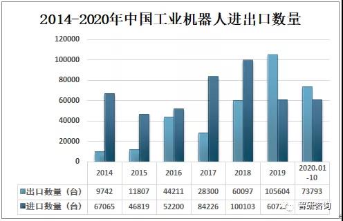 2019年中國工業(yè)機器人首次出口數(shù)量大于進(jìn)口數(shù)量,出口數(shù)量為105604臺,進(jìn)口數(shù)量為60723臺;2020年1-10月中國工業(yè)機器人出口數(shù)量為73793臺,進(jìn)口數(shù)量為61155臺。