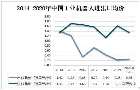 中國出口產(chǎn)品多為中低端產(chǎn)品,高端產(chǎn)品對外依存度仍較大,2019年中國工業(yè)機器人出口均價為0.23萬美元/臺,進(jìn)口均價為1.63萬美元/臺;2020年1-10月中國工業(yè)機器人出口均價為0.26萬美元/臺,進(jìn)口均價為1.35萬美元/臺。