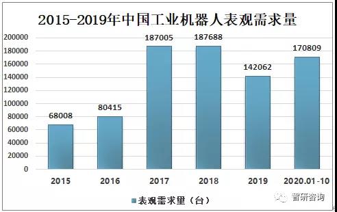 隨著中國經(jīng)濟的快速發(fā)展和勞動力成本的不斷提高,發(fā)展高科技產(chǎn)業(yè),提高制造業(yè)生產(chǎn)自動化水平,由勞動密集型向技術(shù)密集型轉(zhuǎn)變已經(jīng)成為經(jīng)濟發(fā)展模式和制造產(chǎn)業(yè)結(jié)構(gòu)調(diào)整的必由之路。預(yù)計2020年中國將成為全球最大的工業(yè)機器人需求國。2019年中國工業(yè)機器人表觀需求量為142062臺,2020年1-10月中國工業(yè)機器人表觀需求量為170809臺。