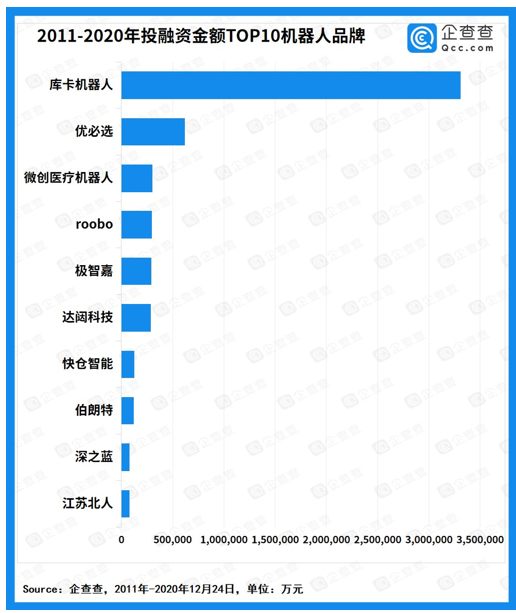 企查查大數(shù)據(jù)研究院日前發(fā)布的《近十年機(jī)器人行業(yè)投融資分析報(bào)告》顯示,近十年我國機(jī)器人賽道共發(fā)生投融資事件2661件,總投融資金額超1385億元,年度融資額最高峰出現(xiàn)在2017年,當(dāng)年總金額達(dá)到524.7億。其中,2020年全行業(yè)共發(fā)生投融資事件242起,總金額約為267.7億元。工業(yè)機(jī)器人(特指狹義上的重工業(yè)制造類機(jī)器人)拿到的融資筆數(shù)最多,占比33%,其次是物流機(jī)器人、醫(yī)療機(jī)器人,分別占比22%、16%。242起投融資事件中,億元級別的項(xiàng)目共64個(gè),微創(chuàng)醫(yī)療機(jī)器人以30億元融資奪得單輪融資金額榜首。從近十年來的融資金額排名來看,企查查數(shù)據(jù)顯示,“庫卡機(jī)器人”于2017年獲330.7億元并購融資,排名首位,美的為其幕后“金主”。位居次席的“優(yōu)必選”十年來共獲八次融資,總金額達(dá)61.7億元。“微創(chuàng)醫(yī)療機(jī)器人”則是憑借2020年獲得的單筆30億融資,躍升至榜單第三。