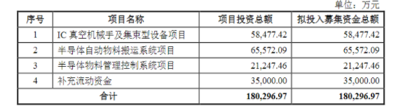 其中半導(dǎo)體裝備業(yè)務(wù)已確定為三大業(yè)務(wù)板塊之一,是新松機(jī)器人未來(lái)重點(diǎn)發(fā)展的業(yè)務(wù)方向。為此,新松機(jī)器人擬募集資金總額不超過(guò)180,296.97萬(wàn)元,將用于IC真空機(jī)械手及集束型設(shè)備項(xiàng)目、半導(dǎo)體自動(dòng)物料搬運(yùn)系統(tǒng)項(xiàng)目、半導(dǎo)體物料管理控制系統(tǒng)項(xiàng)目,以及補(bǔ)充流動(dòng)資金。