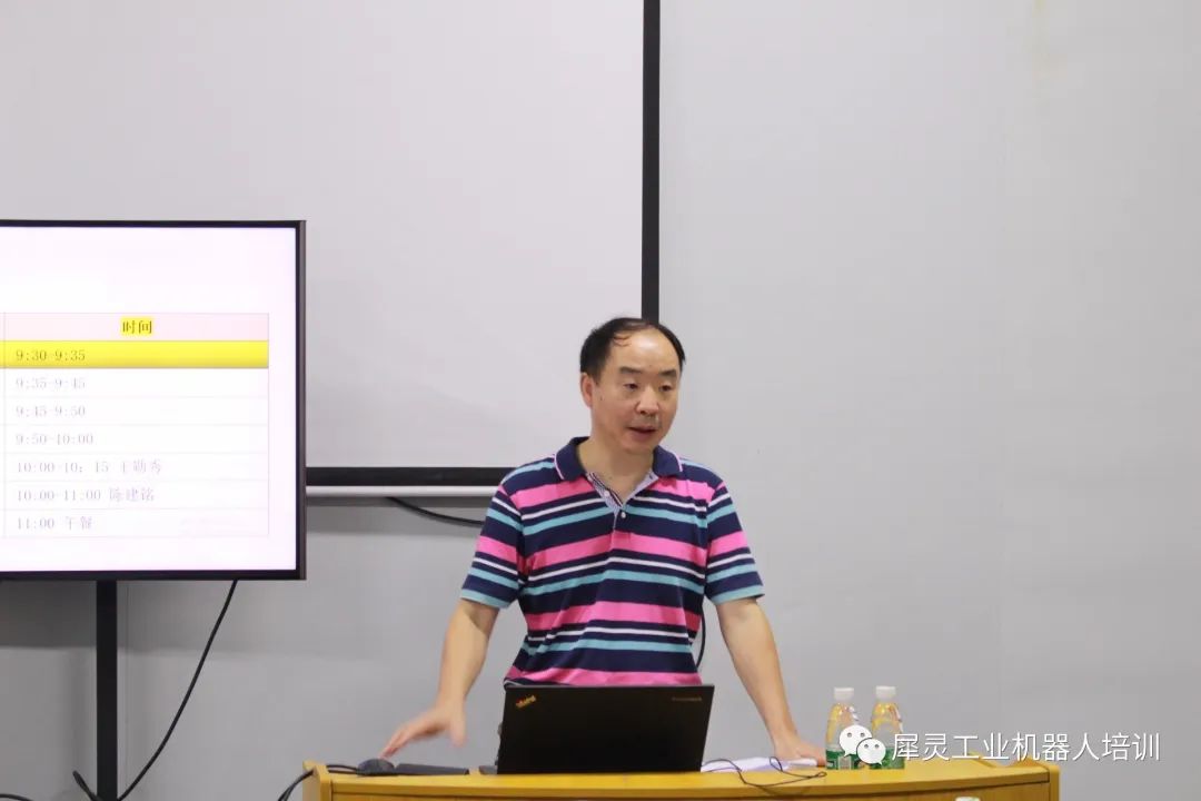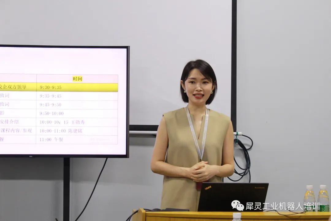 培訓(xùn)處彭次榮主任開(kāi)班致辭廣東匯博機(jī)器人技術(shù)有限公司的曲經(jīng)理對(duì)犀靈培訓(xùn)中心的培訓(xùn)課程體系、證書考核體系、人才培養(yǎng)途徑等六個(gè)專業(yè)共建方面做了簡(jiǎn)單的介紹。