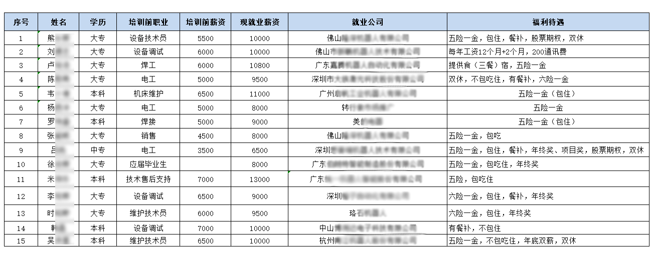 第12期學(xué)員2018年1.5號(hào)畢業(yè),就業(yè)時(shí)間一年多,共15位學(xué)員,截止2019年3.1日,平均薪金為9486元,最讓人振奮的是他們居然100%還在從事著與工業(yè)機(jī)器人相關(guān)的工作。