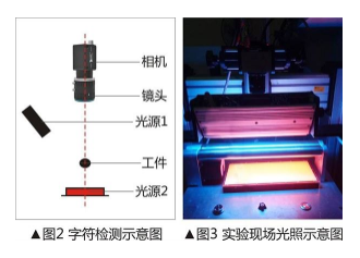 實(shí)驗(yàn)環(huán)境采用自行搭建的模擬現(xiàn)場環(huán)境。如圖2所示:實(shí)驗(yàn)中采用了在印刷行業(yè)中使用率較高的OPT線掃相機(jī),其可在針筒生產(chǎn)過程中連續(xù)、勻速對針筒逐行進(jìn)行掃描,達(dá)到對其整個表面均勻檢測。鏡頭采用高清晰1000萬像素級定焦鏡頭,全視場分辨率可達(dá)140lp/mm,保證了圖像的清晰度。因針筒字符顏色分為黑、紅兩種顏色,需要采用同一種打光方式達(dá)到兼容目的,實(shí)驗(yàn)中,我們采用OPT-LSG高亮線形光源系列從工件斜上方進(jìn)行打光,此打光方式,能夠使字符與背景產(chǎn)生明顯對比,同時能夠滿足兼容。此外因針筒的形狀為圓柱體,若只采用單一的前光打光,無法排除相對面的字符的干擾,因此需要在此基礎(chǔ)上添加OPT-FLP平行背光源系列進(jìn)行輔助打光消除干擾。