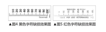 注射器針筒為透明圓柱體,在檢測字符時無法一次性檢測完全。在利用線陣相機(jī)進(jìn)行采集圖像時,會因注射器針筒的透明因素,在檢測一側(cè)字符時,相對面的字符會對檢測造成干擾。如圖1所示,此次實(shí)驗(yàn)中針筒上方字符顏色為黑紅兩種,需要考慮到生產(chǎn)過程中的兼容性。