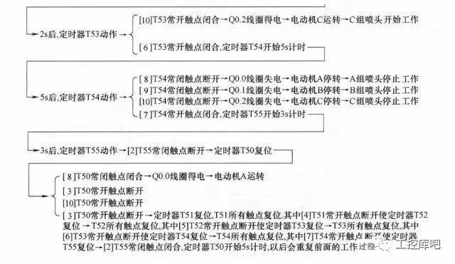 當(dāng)按下起動(dòng)按鈕后,A組噴頭先噴5s后停止,然后B、C組噴頭同時(shí)噴,5s后,B組噴頭停止、C組噴頭繼續(xù)噴5s再停止,而后A、B組噴頭噴7s,C組噴頭在這7s的前2s內(nèi)停止,后5s內(nèi)噴水,接著A、B、C三組噴頭同時(shí)停止3s,以后重復(fù)前述過(guò)程。按下停止按鈕后,三組噴頭同時(shí)停止噴水。下圖為A、B、C三組噴頭工作時(shí)序圖。