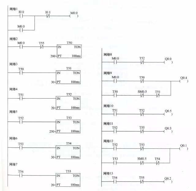 在上圖所示的梯形圖中,采用了一個(gè)特殊的輔助繼電器SM0.5,稱為觸點(diǎn)利用型特殊繼電器,它利用PLC自動(dòng)驅(qū)動(dòng)線圈,用戶只能利用它的觸點(diǎn),即畫梯形圖里只能畫它的觸點(diǎn)。SM0.5能產(chǎn)生周期為1s的時(shí)鐘脈沖,其高低電平持續(xù)時(shí)間各為0.5s,以上圖梯形圖網(wǎng)絡(luò)9為例,當(dāng)T50常開觸點(diǎn)閉合,在1s內(nèi),SM0.5常閉觸點(diǎn)接通、斷開時(shí)間分別為0.5s,Q0.4線圈得電、失電時(shí)間也都為0.5s。