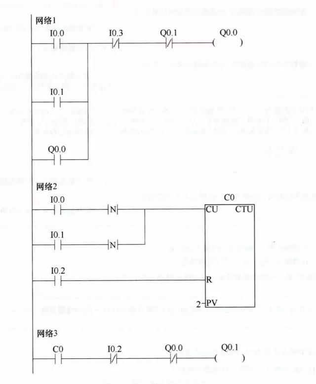 啟動(dòng)STEP 7-Micro/WIN編程軟件,編寫滿足控制要求的梯形圖程序,編寫完成的梯形圖如下圖所示。