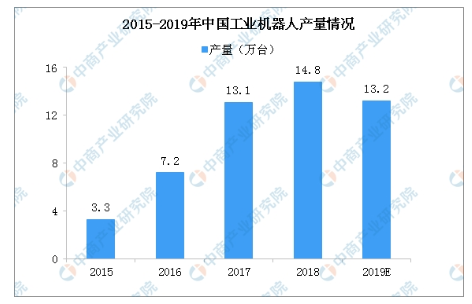 近年來(lái),我國(guó)工業(yè)機(jī)器人行業(yè)迅猛發(fā)展,產(chǎn)量持續(xù)增長(zhǎng)。2015年我國(guó)工業(yè)機(jī)器人產(chǎn)量?jī)H3.3萬(wàn)臺(tái),2018年產(chǎn)量逼近15萬(wàn)臺(tái)。2019年全球大環(huán)境下行,制造業(yè)企業(yè)對(duì)機(jī)器人需求下降,中國(guó)機(jī)器人產(chǎn)量有所下降。2019上半年全國(guó)工業(yè)機(jī)器人產(chǎn)量75406臺(tái),同比減少10.1%。預(yù)計(jì)2019年中國(guó)工業(yè)機(jī)器人產(chǎn)量將重回2017年水平。