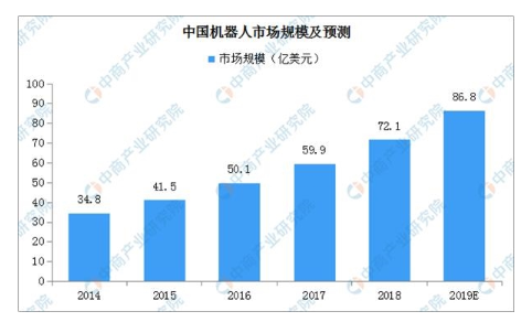 當(dāng)前,中國(guó)機(jī)器人產(chǎn)業(yè)優(yōu)勢(shì)明顯,競(jìng)爭(zhēng)力不斷加強(qiáng),產(chǎn)業(yè)規(guī)模持續(xù)擴(kuò)大。預(yù)計(jì)2019年中國(guó)機(jī)器人市場(chǎng)規(guī)模將達(dá)86.8億美元。其中,工業(yè)機(jī)器人市場(chǎng)規(guī)模約為57.3億美元,服務(wù)機(jī)器人市場(chǎng)規(guī)模約為22億美元,特種機(jī)器人市場(chǎng)規(guī)模約為7.5億美元。