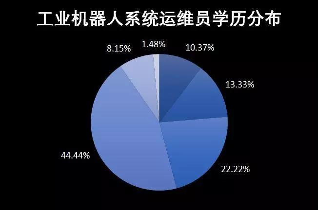 44.44%的工業(yè)機(jī)器人系統(tǒng)運(yùn)維員是??茖W(xué)歷,1.48%為碩士研究生,45%的學(xué)歷為大專及以下。工業(yè)機(jī)器人系統(tǒng)運(yùn)維員就業(yè)門檻低。