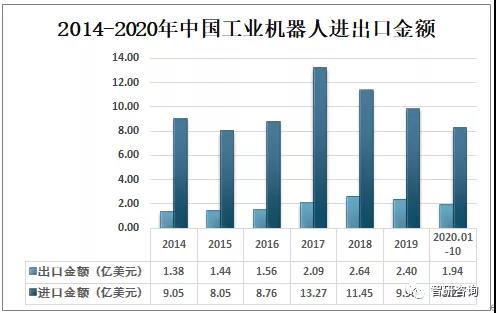 2019年中國工業(yè)機器人出口金額為2.4億美元,進(jìn)口金額為9.9億美元;2020年1-10月中國工業(yè)機器人出口金額為1.94億美元,進(jìn)口金額為8.29億美元。